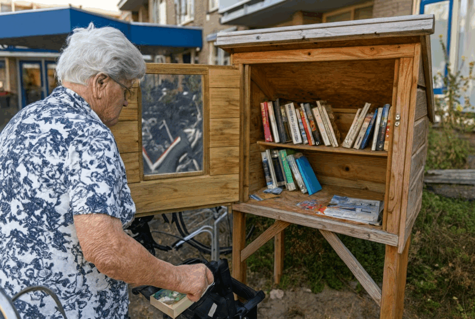Een mooi voorbeeld: een bewoonster gaf aan graag weer eens naar het houten boekenkastje bij de hoofdingang te willen lopen. Buiten lopen is voor haar niet vanzelfsprekend. Samen met de fysiotherapeut lukte het toch. Ze leverde een boek in, koos een nieuw uit én oefende ondertussen balans, conditie en loopvaardigheid.